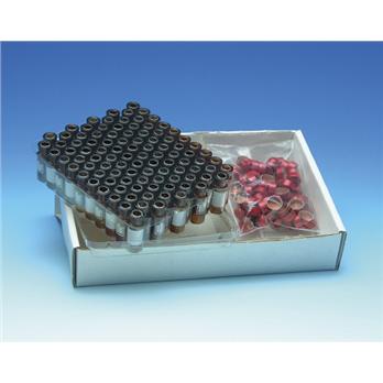 1.8 mL capacity12 x 32 mmScrew threadWith or without patchColor coded PP capsThe ABC Vial™ Convenience Packs include 1.8 mL vials packaged in a recyclable PETE plastic clamshell to help prevent particulate contamination; caps are also included. Vials and ABC Screw Thread Caps are available assembled together in convenience packs of 100. The amber vials are made of Type 1 borosilicate glass. The ABC Screw Thread Caps are available in six liner types.