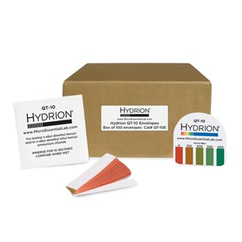 Hydrion QT-10E Quaternary Test Paper provides a simple, reliable, and economical means to measure the concentration of Quaternary Sanitizers, specifically Alkyldimethylbenzyl ammonium compounds, Rocall II, and Hyamine 3500. With color matches at 0-100-200-300-400ppm (parts per million), the test paper measures concentrations between 0-400ppm, detecting exhaustion of solutions that should be replaced as well as helping to avoid using excessive amounts of sanitizing agents.Federal, State and Local health regulations require users of Quaternary Ammonium Sanitizer Solutions to have appropriate test kits available to verify the strength of sanitizer solutions. Sanitizer solutions are essential in the food service industry to ensure that sanitizers are at the proper concentration specified by the individual manufacturer.Each carton contains 100 envelopes, each containing of 15 strips of test paper and matching color chart. Provides for approximately 1,500 tests.Procduct Directions:Dip the strip into the sanitizing solution for 10 seconds, then instantly compare the resulting color with the enclosed color chart which matches concentrations of 0-100-200-300-400ppm.Contact your Local, State or Federal Health Department for Quaternary Ammonium Sanitizer concentration requirements. These concentrations may vary depending on your specific application.