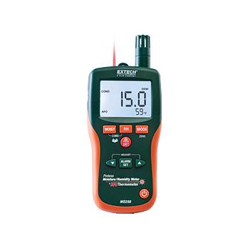 8-in-1 Meter with Patented Built-in IR ThermometerMeasure Humidity, Air Temperature (with built-in probe) plus non-contact InfraRed TemperaturePinless moisture sensor allows to monitor moisture in wood and other building materials with no surface damageRemote pin-type probe (MO290-P) for contact moisture readings (3ft/0.9m cable length)Select from multiple wood types and measurement rangesEasy to read, large dual display with backlit featureSimultaneously displays % moisture of wood or material being tested and Air Temperature, IR Temperature, or HumidityPinless measurement depth to 0.75 " (19mm) below the surfaceNon-Contact InfraRed Thermometer with 8:1 distance to spot ratio and 0.95 fixed emissivityBuilt-in Humidity/Temperature probe measures Relative Humidity, Air Temperature plus Grains Per Pound (GPP), Dew Point (DP), and Vapor PressureProgrammable high/low Moisture and Humidity alarmsAutomatic calculation of differential Temperature (IR - DP) to determine condensation pointMin/Max and Data Hold, Auto Power OffComplete with battery and pouch case