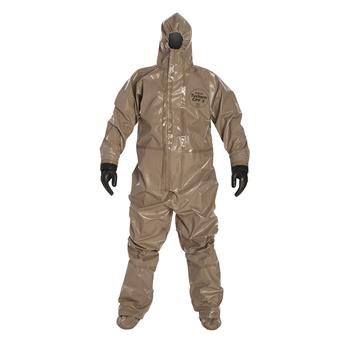 Tychem® 5000 fabric is composed of a multi-layer film barrier laminated to a durable 2.0 oz/yd2 polypropylene substrate. Tychem® 5000 fabric is strong and durable for rigorous activities and rugged situations involving liquid splash and provides barrier to a broad range of chemicals. Typical Applications: chemical handling, petro-chemical, hazardous materials/waste clean-up, fire departments, industrial hazmat teams, utilities, and domestic preparedness. Commonly used in domestic preparedness for situations where the potential to exposure to chemicals exist.Tychem® CPF3 HD garments were designed with extensive input from first responders to ensure that HAZMAT, law enforcement, military and hospital personnel get the protection they need from chemical warfare agents (including Sarin, Mustard, and Lewisite) and toxic industrial chemicals (TIC's).Taped seams provide strong chemical resistance against heavy liquid splashes. A sewn seam is covered with a strip of compatible chemical-resistant material through heat sealing.Three-piece hood design with longer zipper that extends to chin for complete coverage of neck area and good fit around a respiratorLarger zipper pull is easier to grasp for easier donning and doffingStorm flap covers zipper which can be secured by the wearer with rugged hook and loop material to prevent intrusion at zipperAttached internal gloves composed of five layer laminate film for a broad range of chemical protectionNeoprene outer gloves deliver high tactility and dexterity to handle tools or weaponsIntegrated socks composed of garment materialAttached flaps are designed to cover boot tops to help reduce potential for liquid intrusionTychem® 5000 Coverall. Respirator Fit Hood. Attached Dual Layer Gloves, Internal: Multi-layer laminate / External: Neoprene. Attached Socks with Outer Boot Flaps. Double Storm Flap with Hook & Loop Closure. Taped Seams. Tan.