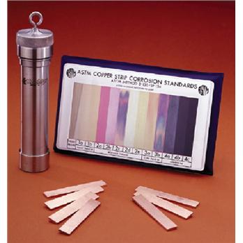 Copper Strip Corrosion Test BombConforms to range of standardsPrecision-machined stainless steel bomb inserts in copper corrosion bath for testing aviation fuels and natural gasoline. Bomb withstands test pressure of 100 psi (689 kPa) per specifications. Threaded cap with O-ring gasket and knurled circumference hand tightens to a positive seal. A 1/8” groove in the bomb threads permit safe, gradual release of pressure when opening the bomb. Device conforms to specifications of ASTM D130, D6074, D6158, IP 154, ISO 2160, DIN 51759, FTM 791-5325 and NF M 07-015. Shipping weight is 2 lbs.Unit tests the corrosiveness of aviation test fuels towards silver. A polished silver strip is immersed in a fuel sample at an elevated temperature. After a specified test period, the strip is removed from the sample, washed and evaluated for corrosion.The fully insulated, thermostatically controlled water bath features a constant water level device. The bath is used in conjunction with the Batch Conversion Kit to immerse six 350 mL test tubes for silver strip corrosion tests. Bath features stainless steel, double-wall construction. Unit conforms to IP 227 specifications.