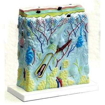 This cross-sectional view of the human skin, enlarged 105 times, gives students a close-up and 3 dimensional view. It shows three layers and a detailed view of the sweat gland, fatty tissue, and hair follicle. A color key is included.