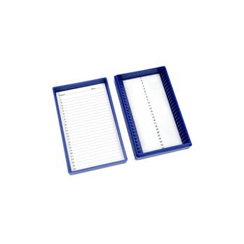 Slide boxes are perfect for storage or transportation of standard size slides (25 x 75 mm and 1 x 3 ").Molded, rigid boxes securely hold slides in grooved slotsDurable ABS plastic boxes are available with either cork or foam liningBoth the lining and the slots are numbered to correspond to the slide inventory sheetEasily access slides with friction-fit coverL x W x H: 141 x 88 x 35 mm