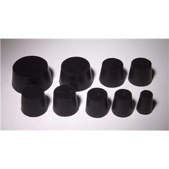 These black stoppers are made of solid natural rubber that remains pliable over an extended period. They are ideal for use with non-aggressive or concentrated solutions, featuring low sulfur content. The stoppers withstand temperatures ranging from -25 to 70°C (-13 to 158°F). Available in solid, one-hole, and two-hole versions, each stopper has its size marked in raised figures. All stoppers stand at a height of 25 mm. They are sold in one-pound bags.