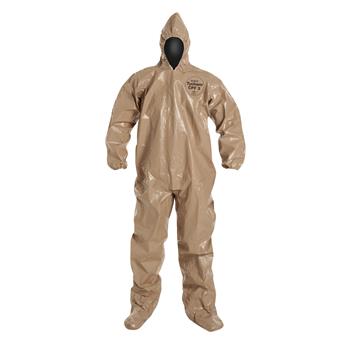 Tychem® 5000 fabric is composed of a multi-layer film barrier laminated to a durable 2.0 oz/yd2 polypropylene substrate. Tychem® 5000 fabric is strong and durable for rigorous activities and rugged situations involving liquid splash and provides barrier to a broad range of chemicals. Typical Applications: chemical handling, petro-chemical, hazardous materials/waste clean-up, fire departments, industrial hazmat teams, utilities, and domestic preparedness. Commonly used in domestic preparedness for situations where the potential to exposure to chemicals exist.Taped seams provide strong chemical resistance against heavy liquid splashes. A sewn seam is covered with a strip of compatible chemical-resistant material through heat sealing.Attached hood with elastic around face openingStrong zipper for tough, flexible closureStorm flap covers zipper which can be sealed by the wearer with adhesive strip to prevent intrusion at zipperElastic opening for tighter fit at wristIntegrated socks composed of garment materialTychem® 5000 Coverall. Standard Fit Hood. Elastic Wrists. Attached Socks. Storm Flap with Adhesive Closure. Taped Seams. Tan.