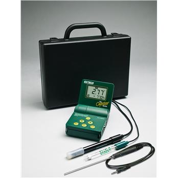 Specifications Large LCD built into adjustable "flip-up " cover displays measurement and Temperature simultaneouslyMicroprocessor based with splash proof housing and front panel tactile touch pad to slope and calibrateRugged design for handheld or benchtop use; neckstrap for "hands-free " operationMemory function stores and recalls 25 labeled readingsAutomatic Temperature Compensation for Conductivity/TDS via thermistor built into conductivity cellManual Temperature Compensation for pH (0 to 100°C)Thermistor probe measures from 32 to 194°F (0 to 90.0°C)Complete with mini pH electrode, sample buffers, polymer conductivity cell for TDS/Conductivity/Salinity, thermistor probe, 9V battery, neckstrap and carrying case RangeResolutionBasica AccuracypH0.01 to 14.00pH0.01pH±0.02pHConductivity10 to 19,990μS0.1μS±2%FSTDS10 to 19,990ppm (mg/L)0.1ppm±2%FSORP-1500mV to 1500mV1mV±3mVSalinity0 to 10.00ppt0.01ppt±2%FSTemperature32.0°F to 194.0°F(0.0°C to 90.0°C)0.1°±2°F/1°CDimensions3.7 x 4.2 x 2 " (96 x 108 x 45mm)Weight12oz (340g)