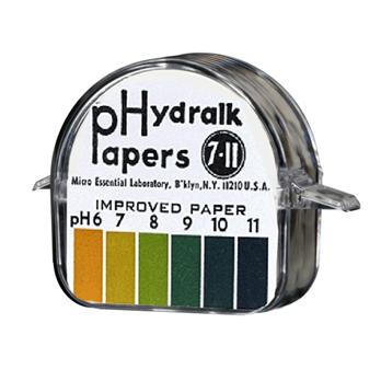 This Hydrion™ double roll dispenser holds two 15 foot rolls of pH paper with a wide range readable from pH 6-11. The dispenser is constructed of polystyrene with stainless steel cut off lips.This wide range paper has a sharp color change for each full pH unit.The pH color chart is printed on the side of the case.2 rolls/dispenser; 10 dispensers/carto