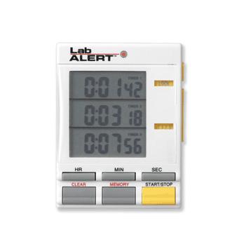 Triple TimerChannels may be started independently or simultaneously. Three independent channels count down with simultaneous LCD display, time-out and 60-second audible alarm. Count down from 20 hours; timer automatically counts up after count-down reaches zero to show time elapsed since alarm. Memory recalls previous interval settings. Alternately displays clock and stopwatch (to 1/100 sec.) Magnetic back allows mounting on metal surfaces. Includes two-year battery. Measures 64 x 86 x 22mm.