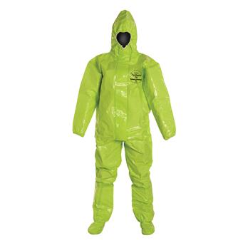 Tychem® 10000 exhibits excellent chemical barrier properties and offers an extremely durable fabric that is puncture- and tear-resistant. Tychem® 10000 fabric shows at least 30 minutes of barrier protection to 322 challenge chemicals with no observed breakthrough. Tychem® 10000 is specifically developed for protection against toxic, corrosive gases, liquids and solid chemicals. This high-performance chemical barrier fabric is suited for industrial, HazMat, and domestic preparedness applications.Taped seams provide strong chemical resistance against heavy liquid splashes. A sewn seam is covered with a strip of compatible chemical-resistant material through heat sealing.Attached respirator-fit hood with elastic around face opening, designed to cover neck and chin and fit around respirator face maskStrong zipper for tough, flexible closureLonger zipper extends to chin for complete coverage of neck areaStorm flap covers zipper which can be sealed by the wearer with two adhesive strips to prevent intrusion at zipperElastic opening for tighter fit at wrist Integrated socks composed of garment materialAttached flaps are designed to cover boot tops to help reduce potential for liquid intrusionMade in the USA, North American Free Trade Agreement (NAFTA) compliant and Trade Agreement Act (TAA) compliantTychem® 10000 Coverall. Respirator Fit Hood. Elastic Wrists. Attached Socks with Outer Boot Flaps. Double Storm Flap with Adhesive Closure. Taped Seams. Lime Yellow.