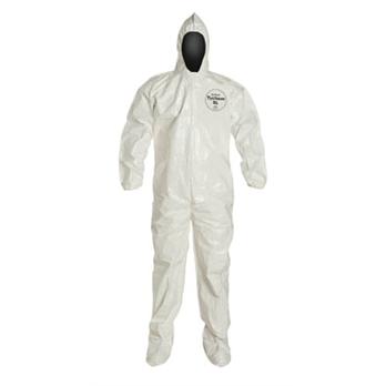 DuPont™ Tychem® 4000 delivers effective protection against a range of chemical environments. Tychem® 4000, utilizes Saranex™ 23-P film laminated to Tyvek® fabric to provide a rugged and durable fabric that resists abrasion. Tychem® 4000 fabric provides at least 30 minutes of protection against >124 chemical challenges. Typical applications: chemical mixing, hazardous remediation, emergency medical response, paint spraying, and nuclear environments.Tightly sewn seam is covered with garment fabric to reinforce seam and reduce potential for particle penetrationAttached hood with elastic around face openingStorm flap covers zipper which can be sealed by the wearer with adhesive strip to prevent intrusion at zipperElastic opening for tighter fit at wristIntegrated socks composed of garment material