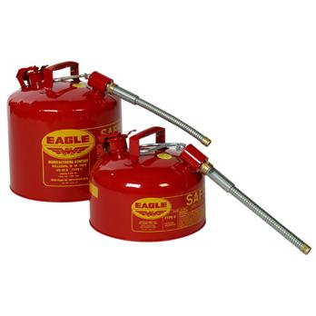 Specifications Eagle Type I Stainless Steel Safety Cans are made completely of sturdy 24 gauge type 316 stainless steel in 2-1/2 and 5 gallon capacities. Stainless steel flame arrestor. Electric seam weld joins top and body. Sturdy 16 gauge shock rim for bottom support and Buna Rubber gaskets.Eagle Type II Safety Cans are made of Galvanized Steel and help reduce the danger of explosion while dispensing flammable liquids thru a flexible 12 " metal spout. Flame arrestors in filler opening and pour spout.Type I StainlessCapacity (gal)DimensionsModelWeight 2.5 gallons11-1/4 " x 9-5/8 "0360A398 lbs. 5 gallons11-1/4 " x 15-7/8 "0360A4110 lbs. Type IICapacity (gal)Dimensions7/8 " Spout5/8 " SpoutWeight2 gallons11-1/4 " x 9-1/2 "0360A200360A228 lbs.5 gallons12-1/2 " x 13-1/2 "0360A230360A2510 lbs.