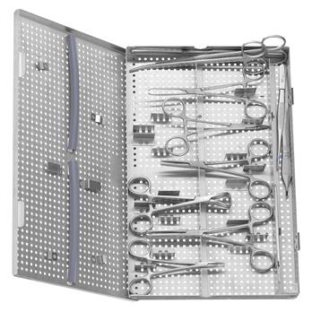 Kit includes:QuantityDescription1Mayo Scissors, Straight, 6-3/4 " (17.1 cm)1#3 Scalpel Handle1Snook Hook, 8 " (20.3 cm)3Mosquito Forceps, Curved, 5 " (12.7 cm)2Kelly Forceps, Straight, 5-1/2 " (14 cm)1Metzenbaum Scissors, Curved, 7 " (17.8 cm)1Brown-Adson Forceps, 7 X 7 Teeth, 4-3/4 " (12.1 cm)4Rochester-Carmalt Forceps, Curved, 6-1/4 " (15.9 cm)4Backhaus Towel Clamps, 5-1/4 " (13.3 cm)1Olsen-Hegar Needle Holder, Tungsten Carbide, 5-1/2 " (14 cm)1Storage Cassette, 15 " (38.1 cm) X 8-1/4 " (21 cm) X 1-1/4 " (3.1 cm)