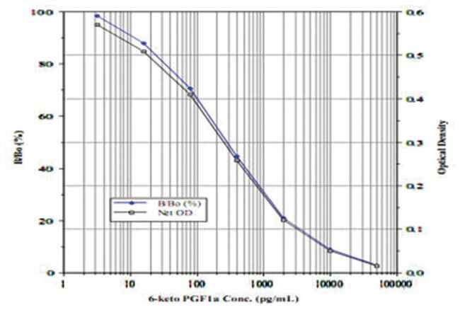 The kit uses a polyclonal antibody to 6-keto-PGF1α to bind, in a competitive manner, the 6-keto-PGF1α in the standards or sample or an alkaline phosphatase molecule which has 6-keto-PGF1α covalently attached to it