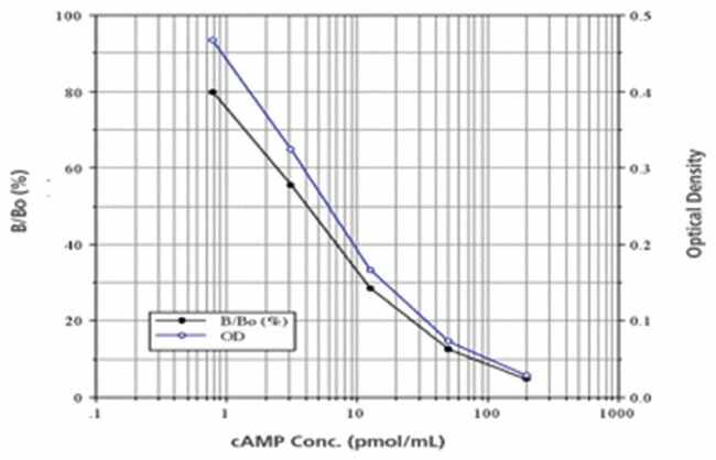 Use to measure quantitatively cyclic AMP in cells and tissue treated with 0.1M HCl, in addition to culture supernates, saliva, and serum. A kit.