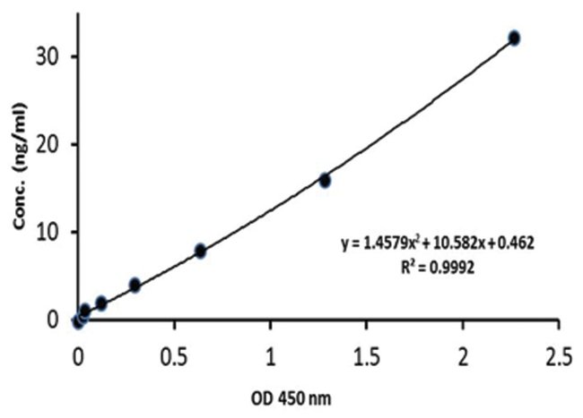 This assay is a sandwich ELISA which utilizies a 96-well microtiter plate which was pre-coated with a monoclonal antibody and a purified polyclonal detection antibody