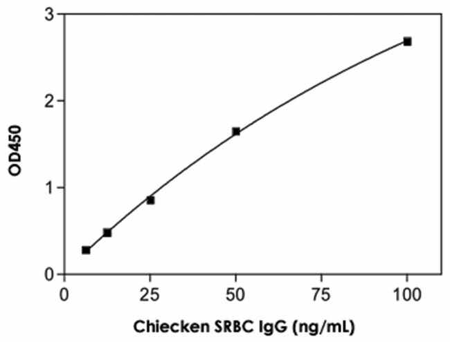 The SRBC IgG (Chicken) ELISA Kit uses detergent solubilized SRBC ghosts for solid phase (microtiter wells) immobilization and horseradish peroxidase (HRP) conjugated anti-chicken IgG antibodies for detectio