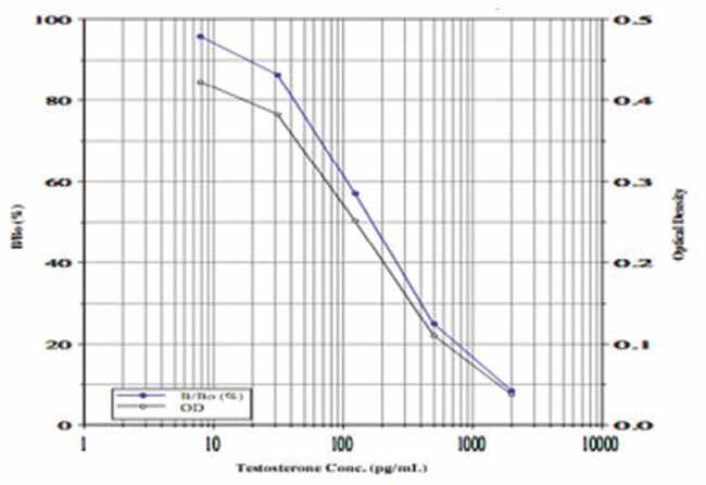 This kit uses a monoclonal antibody to Testosterone to bind, in a competitive manner, Testosterone in the standard or sample or an alkaline phosphatase molecule which has Testosterone covalently attached to it