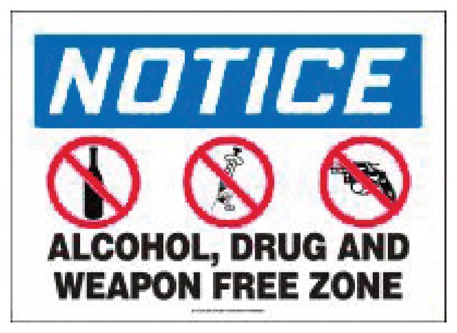 Alcohol Drug and Weapon Free Zone, Use posted notice signs to identify zones that do not allow certain items, Each