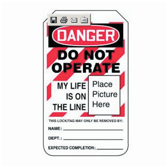 Legend: DANGER. DO NOT OPERATE. MY LIFE IS ON THE LINEIncludes space for photoHigh-strength, matte-surface, mar-, tear-, weather- and chemical-resistant sign for dirty and greasy environmentsSize: 14.6 × 8.3cm (5.75 × 3.25 in.)15-mil thick rigid self-laminating plastic 9.53mm (3/8 in.) hole with reinforced metal grommet