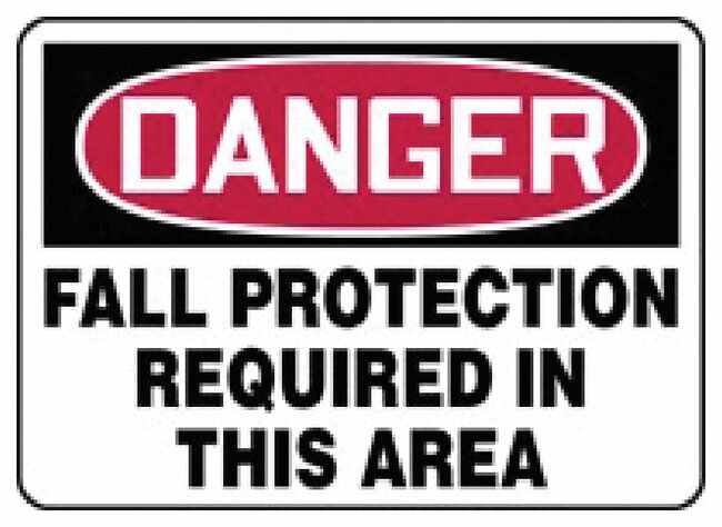 Legend: DANGER: FALL PROTECTION REQUIRED IN THIS AREASize: 25.4 × 35.6cm (10 × 14 in.)Material: PlasticColor: White, black, redLanguage: English