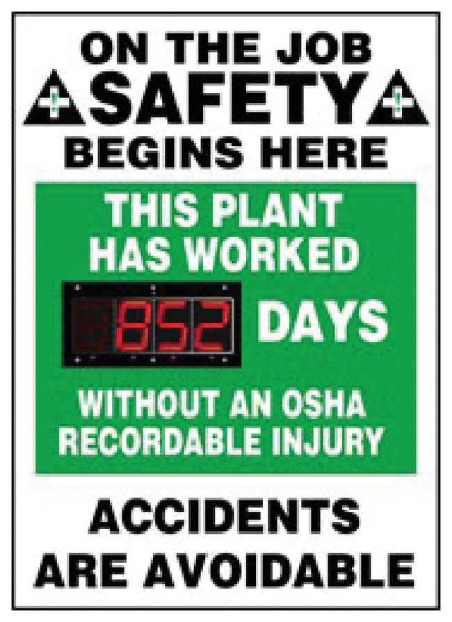 Shows safe work days by counting up electronically and automatically. If a lost time accident occurs, it's easy to set the display back to zero.Innovatively designed frameless construction in durable, lightweight aluminumImage goes to the edge, then wraps 2 in, deep for visual edge and unmistakable impactBuilt-in hidden mounting systemDigital numbers advance one by one, every 24 hours2 1/2 in. digits stand out in bright red LEDEasy handheld remote allows user to set the time at which counter advancesSaves last number in event of power failureOrder InfoFor indoor use. Dim: 28 x 20 x 2 in. frameless aluminum. Operates on 110VAC with 6 ft. power cord.Custom scoreboards available to carry your unique message; contact your Fisher Safety Customer Service Representative for ordering information.