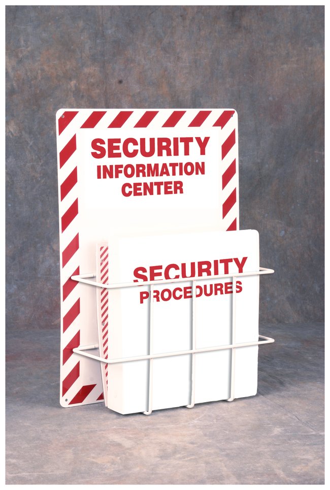 .063 in. Aluminum backboard H x W: 20 x 15 in. (50.8 x 38.1cm)Printed with bold red stripes for high visibilityAttached coated-wire basket with 1.5 in. dia. (3.81cm), three-ring binderFour corner mounting holes for easy installatio