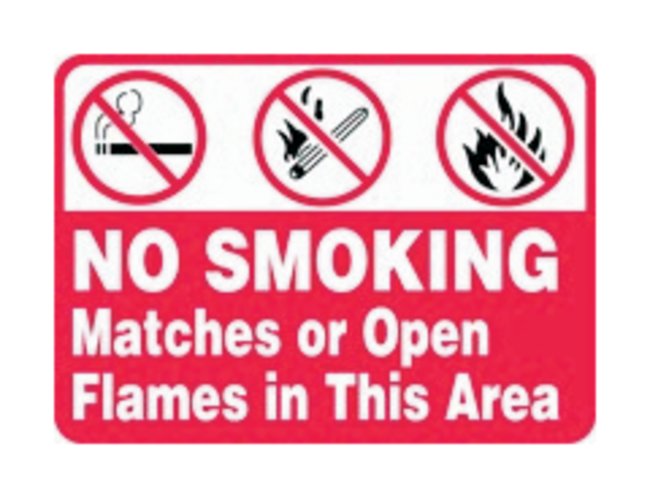 No Smoking, Matches Or Open Flames In This Area, Caution passersby that smoking, matches, and open flames will not be permitted in area, Each