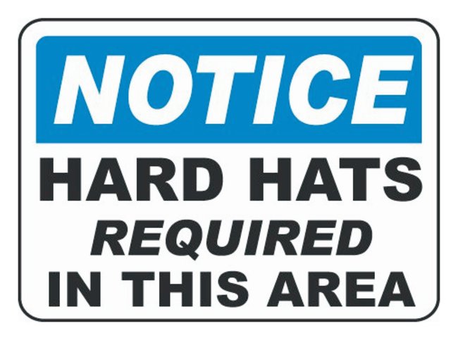 Blue and WhiteMessage: “NOTICE: HARD HATS REQUIRED IN THIS AREA”10 x 14 in.