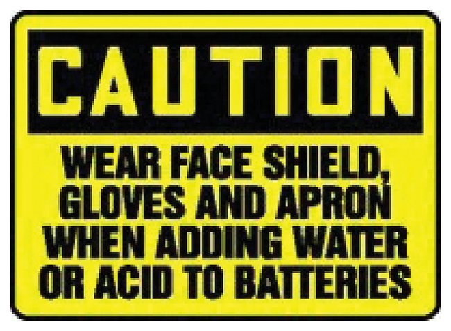 Wear Face Shield, Gloves and Apron, Ensure your employees have the proper safety gear for adding water or acid to batteries, Each