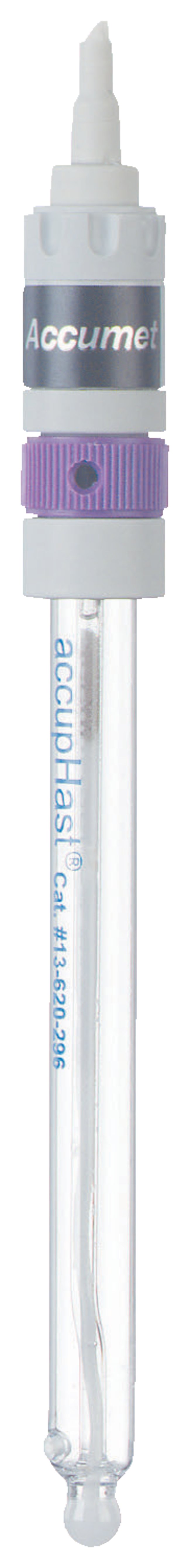 Fast, accurate response despite temperature changesPatented design with dual ceramic junctions, sealed Ag/AgCl reference and special electrolyteEliminates slow response when measuring samples at different temperatures in quick successionAccurate to ±0.01pH at 25°C and ±0.05pH from -5° to 80°CResponse time, 20 seconds or less; negligible driftImproved flow, less contaminationIsolated reference element and outer KCl fill solutionEliminates clogging from silver compound precipitatesNo silver or mercury to contaminate samplesChoice of standard and MicroProbe™ glass or extra-long epoxy bodies accupHast Standard Glass Body ElectrodeStandard size glass bodyImmersion to 102mmBody and tip diameter, 10mmaccupHast MicroProbe Glass Body ElectrodeSemimicro size glass bodyImmersion to 165mmBody diameter, 10mm; tip diameter, 5mmaccupHast Extra-Long Epoxy Body ElectrodeExtra-long epoxy bodyImmersion to 140mmBody diameter, 10mmaccupHast Extra-Long Epoxy Body pH/ATC ElectrodeExtra-long epoxy bodyBuilt-in ATC probeImmersion to 143mmBody diameter, 10mm