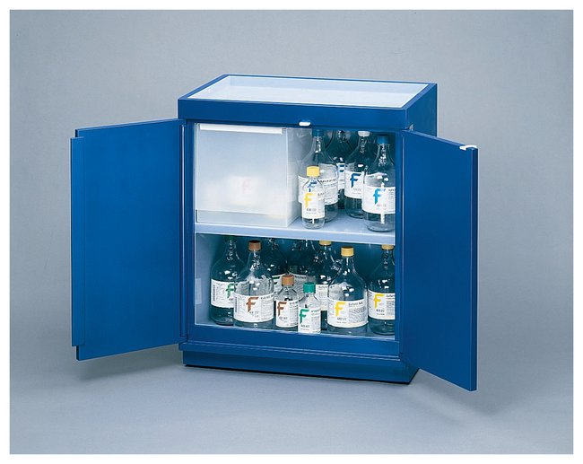 Constructed of 1 in. (2.5cm) thick plywood with acid-resistant epoxy paintWooden dowel hinge assembly eliminates the problem of hinge deteriorationSingle fixed shelf is positioned for storage of large 4L bottles on top shelf and 2.5L bottles on bottom shelfRecessed top with polypropylene tray, holds 12L of spilled liquidFloor includes 2 in. (5.1cm) liquid-tight troughStorage capacity: thirty 2.5L or ninety 500mL bottlesPartially lined model has polypropylene on the floor, shelf and top trayFully lined model has polypropylene on the floor, interior walls, interior top and top trayOrder InfoExterior: 20D × 31W × 36.5 in.H (50.8 × 78.7 × 92.7cm)Interior: 17.13D × 29W × 28.5 in.H (43.5 × 73.7 × 72.4cm)Additional polypropylene slide-in isolation compartment available as an accessory (Cat. No. S51074)