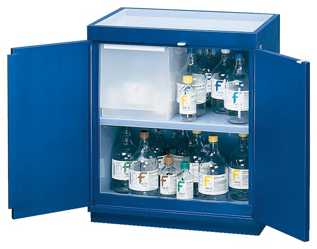 Constructed of 1 in. (2.5cm) thick plywood with acid-resistant epoxy paintWooden dowel hinge assembly eliminates the problem of hinge deteriorationSingle fixed shelf is positioned for storage of large 4L bottles on top shelf and 2.5L bottles on bottom shelfRecessed top with polypropylene tray, holds 12L of spilled liquidFloor includes 2 in. (5.1cm) liquid-tight troughStorage capacity: thirty 2.5L or ninety 500mL bottlesPartially lined model has polypropylene on the floor, shelf and top trayFully lined model has polypropylene on the floor, interior walls, interior top and top trayOrder InfoExterior: 20D × 31W × 36.5 in.H (50.8 × 78.7 × 92.7cm)Interior: 17.13D × 29W × 28.5 in.H (43.5 × 73.7 × 72.4cm)Additional polypropylene slide-in isolation compartment available as an accessory (Cat. No. S51074)