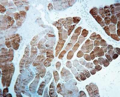 Actin, muscle^ Clone number HHF35. This antibody is specific to alpha and gamma specific actin isomers from skeletal, cardiac and smooth muscle but does not recognize beta and nonsmooth muscle gamma actin isomers. In Western blot, HHF35 picks up 42 kD protein extract from skeletal muscle but not from epithelial cell line.