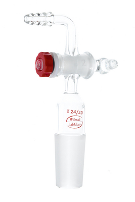 Adapter, 90[degree] Bend, with Hose Connection and Pressure/Vacuum Stopcock^ Joint Size: [ST] 24/40 Inner; Hose Connection: 5/16"; Stopcock Size: 2mm. To control gas/liquid additions in reaction systems. Stopcock has glass plug.
