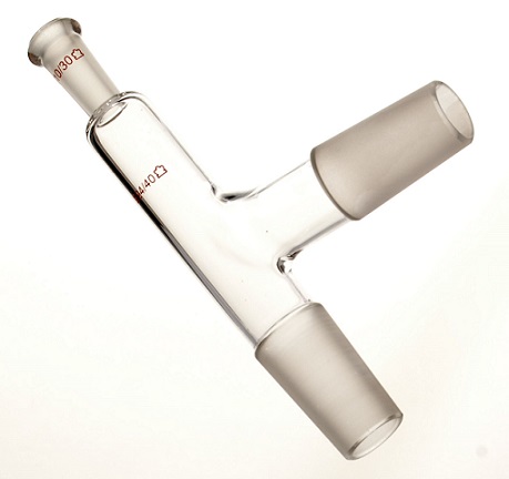 Used in distillation assemblies. Outer Standard Taper top joint accommodates a thermometer, Inner Standard Taper joints are at a 75° angle