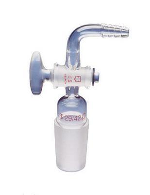 Flow Control Inlet Adapter^ Standard taper 24/40 Inlet Adapter, for regulating input of gases or liquids into reaction systems. Stopcock has glass plug. Hose Connection No. 2. Height: 130mm.