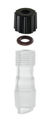 ADAPTER, INLET, MINUM-WARE^ Used with thermometers, bleed tubes, etc. with outside diameters from 5-7mm. A vacuum tight seal is made using the supplied Viton O-ring and nylon compression cap while allowing the vertical adjustment of the thermometer or bleed tube.