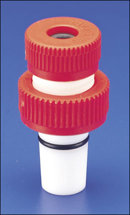 SAFE-LAB, TUBING ADAPTER, PP/TEFLON, 24/40^ Teflon body with Viton O-ring. Polypropylene screw cap on top with inside O-ring for depth adjustment of glass tubing. Bottom inner joint has a SAF-T-LINE threaded extracting nut for easy removal of adapter. Not autoclavable.