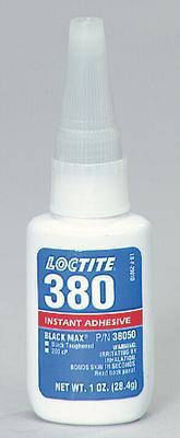 Black Max* 380* Toughened Adhesive^ Bonds metal, rubber, and plastic. Resists peeling, cleavage loading, and stress caused by thermal shock. Cures quickly at room temperature. Fills gaps up to 0.015cm. Temperature range: -53 to 107[degree]C. Viscosity: 200cP. Color: black. 28.4g bottle.