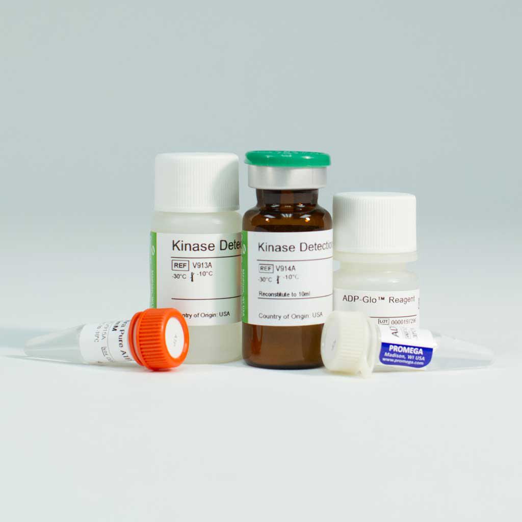 ADP-Glo* Kinase Assay 100,000 assays^ ADP-Glo* Kinase Assay, is a luminescent kinase assay that measures ADP, Components: ADP-Glo* Reagent: 10 x 50ml, Kinase Detection Buffer: 10 x 100ml, Kinase Detection Substrate: 10 x 1 each, Ultra Pure ATP 10mM: 10 x 5ml, ADP 10mM: 10 x 5ml