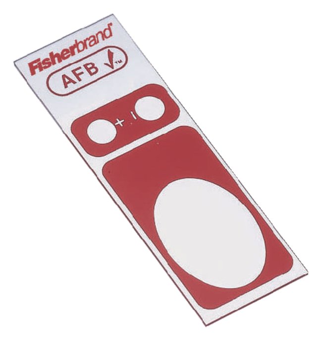 AFB Check Slides are provided with a heat fixed attenuated positive Acid Fast organism and a negative Acid Fast organism with one additional circular area for your unknown specimen.