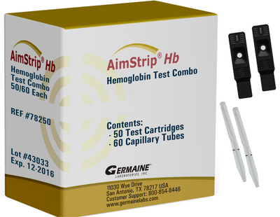 AimStrip* Hemoglobin Test Combo^ Kit, AimStrip* Hemoglobin Test Combo, For testing hemoglobin in whole blood, Combo Includes: 50 Test Cartridges, 60 Capillary Tubes, 1 Code Chip, For professional use only, For in vitro diagnostic use only