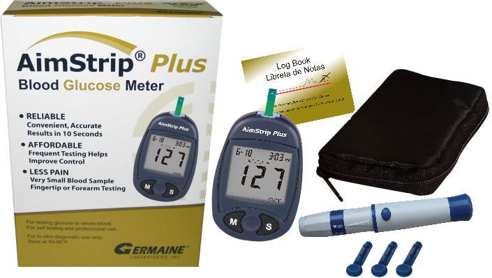Blood Glucose Meter kit^ Blood Glucose Meter Kit, AimStrip* Plus, for use with AimStrip Plus Blood Glucose Strips. 1 meter per kit, A blood glucose meter for use with AimStrip* Plus Blood Glucose Test Strips for testing blood glucose levels, Measurement Range: 20-600mg/dL, Minimum Sample Size: 1 uL