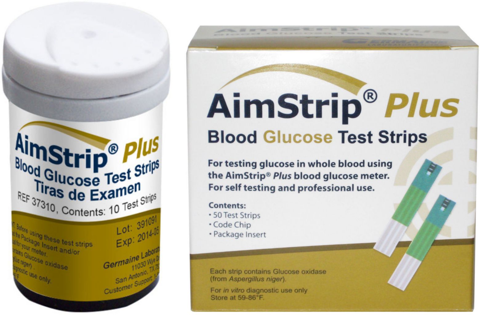 Test Strips^ Blood Glucose Test Strips, AimStrip* Plus, for use with AimStrip* Plus Blood Glucose Meter for testing blood glucose levels, Only 1uL Blood Sample Required from Fingertip or Forearm Testing, Reliable accurate results in 10 seconds, Includes: 50 test strips, Code Chip