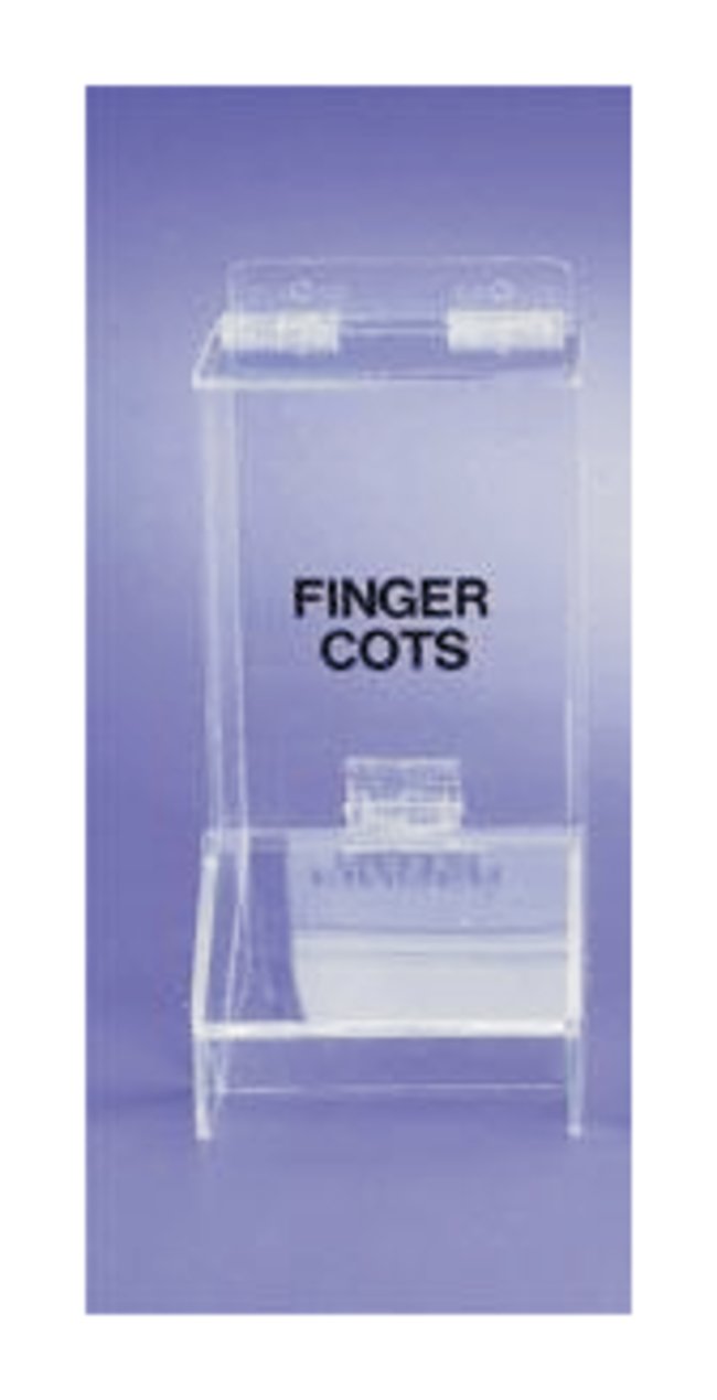 Ideal for dispensing and organizing finger cots in production facilities. Unit features a hinged lid, and bold writing for easy product identification.