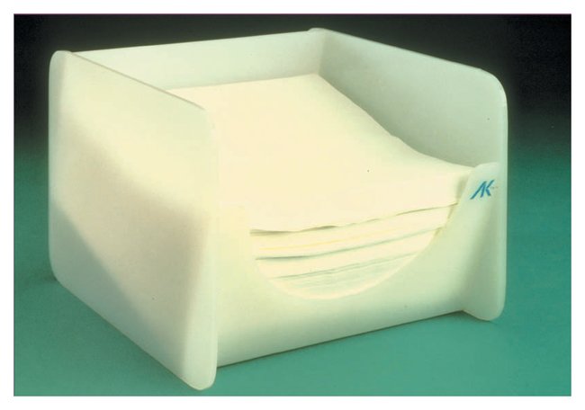 Unique countertop design has slanted interior and front cut-out for fingertip access to clean wipes. Made of 3/16 in. thick (0.5cm) acrylic. Dimensions: 10 × 7 1/2 × 10 in. (25.4 × 19.1 × 25.4cm). White.
