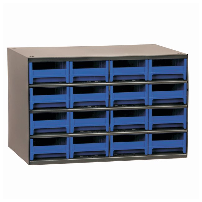 For heavy-duty, color-coded storage/organizationSuper durable cabinets are available with five different drawer sizes and colors.CabinetHeavy-duty welded-steel frame with long-lasting powder-coated finishBuilt-in nesting feet for safe, stable stackingFour keyhole slots for easy wall mountingDesigned to fit side-by-side on standard 36 in.-wide shelvingDimensions: 11D x 17W x 11 in.HDrawersStrong, high-impact polystyrene drawers are rust, corrosion and dent-proofLabel holder and transparent window for content identificationDrawers available in black, blue, gray, red and yellowTwo dovetailed dividers per removable drawer; can be divided into as many as eight compartmentsRear stop tab prevents spills and lossOrder InfoReplacement drawers and additional dividers available; contact your Fisher Scientific Sales Representative for information.