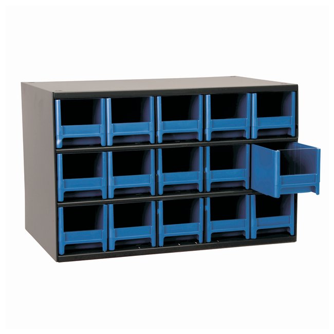 For heavy-duty, color-coded storage/organizationSuper durable cabinets are available with five different drawer sizes and colors.CabinetHeavy-duty welded-steel frame with long-lasting powder-coated finishBuilt-in nesting feet for safe, stable stackingFour keyhole slots for easy wall mountingDesigned to fit side-by-side on standard 36 in.-wide shelvingDimensions: 11D x 17W x 11 in.HDrawersStrong, high-impact polystyrene drawers are rust, corrosion and dent-proofLabel holder and transparent window for content identificationDrawers available in black, blue, gray, red and yellowTwo dovetailed dividers per removable drawer; can be divided into as many as eight compartmentsRear stop tab prevents spills and lossOrder InfoReplacement drawers and additional dividers available; contact your Fisher Scientific Sales Representative for information.
