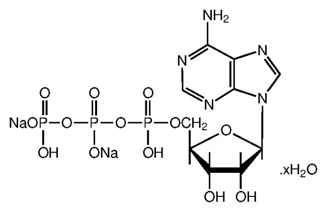 Adenosine-5'-triphosphate disodium salt hydrate is used as a form of cellular energy. It is used in many cellular processes, respiration, biosynthetic reactions, motility, and cell division. ATP is a substrate of many kinases involved in cell signaling and of adenylate cyclase(s) that produce the second messenger cAMP. ATP provides the metabolic energy to drive metabolic pumps. ATP serves as a coenzyme in a wide array of enzymatic reactions.