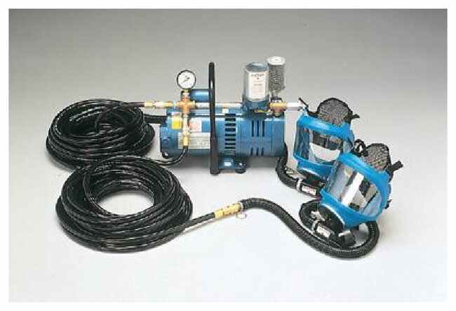 Portable and lightweight air source for one hood use, or up to two full- or half-face respirator usersHansen and Schrader models available.1425rpm at 50Hz, 1725 at 60HzWorking pressure: 2 to 12psi, maximum 15psiBrass and galvanized steel plumbingVolts: 15 to 230V, AC single phaseQuick-connect Rectus (OBAC) fittingAdjustable brass pressure relief valveRigid metal bass and housingWeight: 24kg (53 lb.)Powder coated blueSteel handleOil-lessCertificationsUL Recognized, CSA Certified
